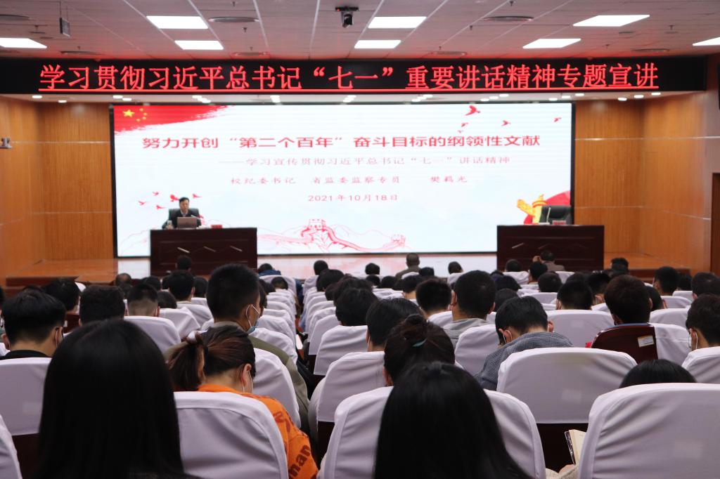 9月18日晚,校纪委书记樊羁光以“努力开创‘第二个百年’奋斗目标的纲领性文献”为题,在图书馆十二楼报告厅为智能工程学院、理学部、体育部和校纪委机关共230余名师生作学习贯彻习近平总书记“七一”重要讲话精神宣讲报告。